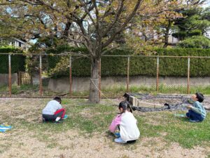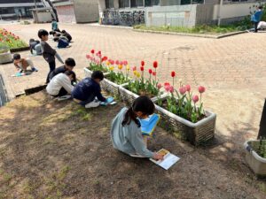 春を感じるものを探し、いろいろな大きさの画用紙に描きました。