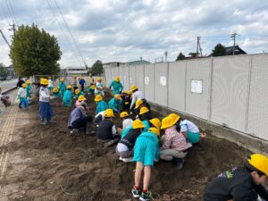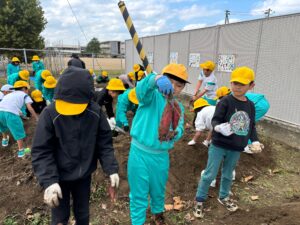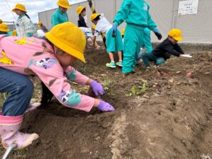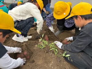 「どのくらい取れるかな?」「たくさん持ち帰りたいな!」「大学芋にして食べたいな!」とワクワクした気持ちでこの日を迎え、掘ってみるとびっくり!顔より大きなさつまいもがたくさんありました!畝が無くなるほど、最後まで一生懸命収穫しました!
