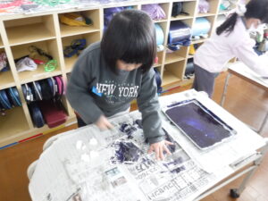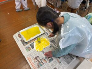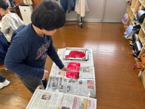 版にインクを付けました。自分の作品に合ったインクの色を決め、様々な模様がきれいに付くように、ローラーを使って端まで丁寧に塗りました。大きい版から小さい版までありましたが、ひとつひとつ場所を調整して転写しました。