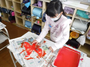 版は粘土で作りました。版画用の粘土を棒で薄く伸ばし、生き物の形にプラスチックのナイフで切って、模様を付けました。棒を使って粘土を伸ばすことが初めての経験の子供が多く、パン作りやお菓子作りをイメージしながら作りました。伸ばす方向や力加減を考えてやってみると、立方体だった粘土が、だんだん薄いクレープのようになり、きれいに伸ばすことができました。