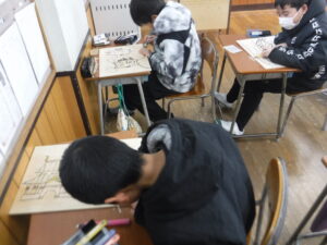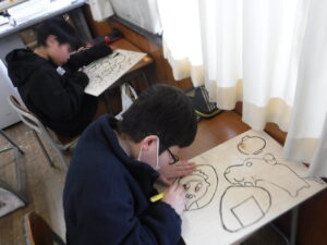 去年よりも掘るところが増えて難しいですが、さまざまな種類の彫刻刀を使い分けて、自分の思いに合った絵を掘ろうとがんばっています。完成が楽しみです!
